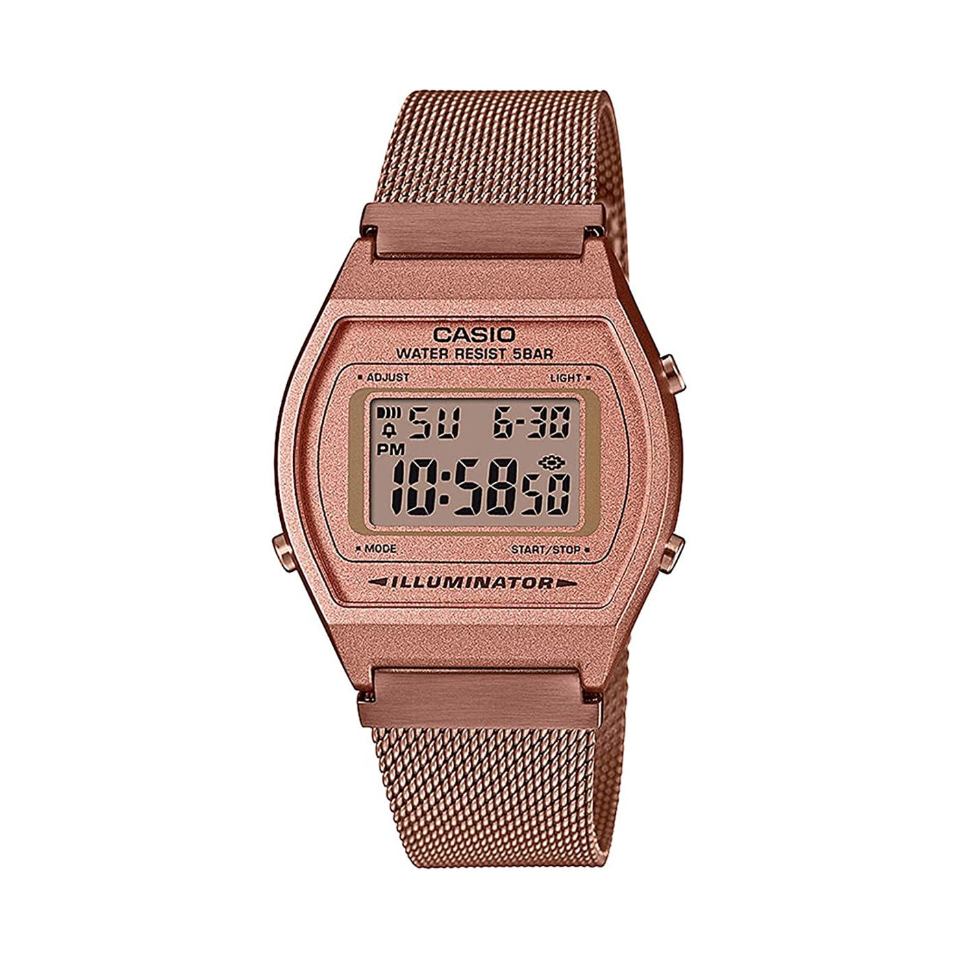 Luce LED Un diodo per l´emissione di luce è utilizzato per illuminare il quadrante. Lampeggio display Un diodo luminoso lampeggia ogniqualvolta scatta un allarme, un conto alla rovescia o il segnale dell’ora. Cronometro – 1/100 sec – 24 ore Rilevazione del tempo trascorso. La frazione indica l’unità di misura mentre il numero indica il tempo massimo di misurazione. Timer – 1/1 sec. – 24 ore (con ripet. automatica) Per chiunque ami la precisione: i timer conto alla rovescia aiutano a ricordare eventi particolari o che si ripetono, emettendo un segnale acustico al momento impostato – quindi riprendono a contare automaticamente dal momento impostato. Il tempo può essere impostato in secondi e con un anticipo di fino a 24 ore – particolarmente pratico per l’assunzione giornaliera di medicinali o l’interval training. Sveglia multifunzione, segnale orario Sveglia per un’ora o data e ora stabilite. Il valore indica quanti allarmi ci sono. Il segnale orario emette un suono ad ogni ora. Calendario automatico Una volta impostato, il calendario automatico visualizza sempre la data esatta. Formato 12/24 ore L’ora può essere visualizzata a 12 o 24 ore. Cassa in resina Bracciale milanese Bracciale con finitura IP Chiusura regolabile 3 anni – 1 batteria Classificazione di impermeabilità (5 bar) 38,9 mm x 35 mm x 9,4 mm Peso |
